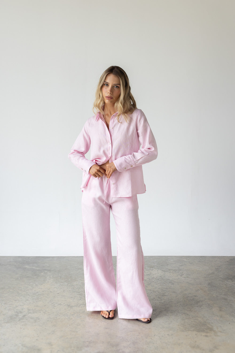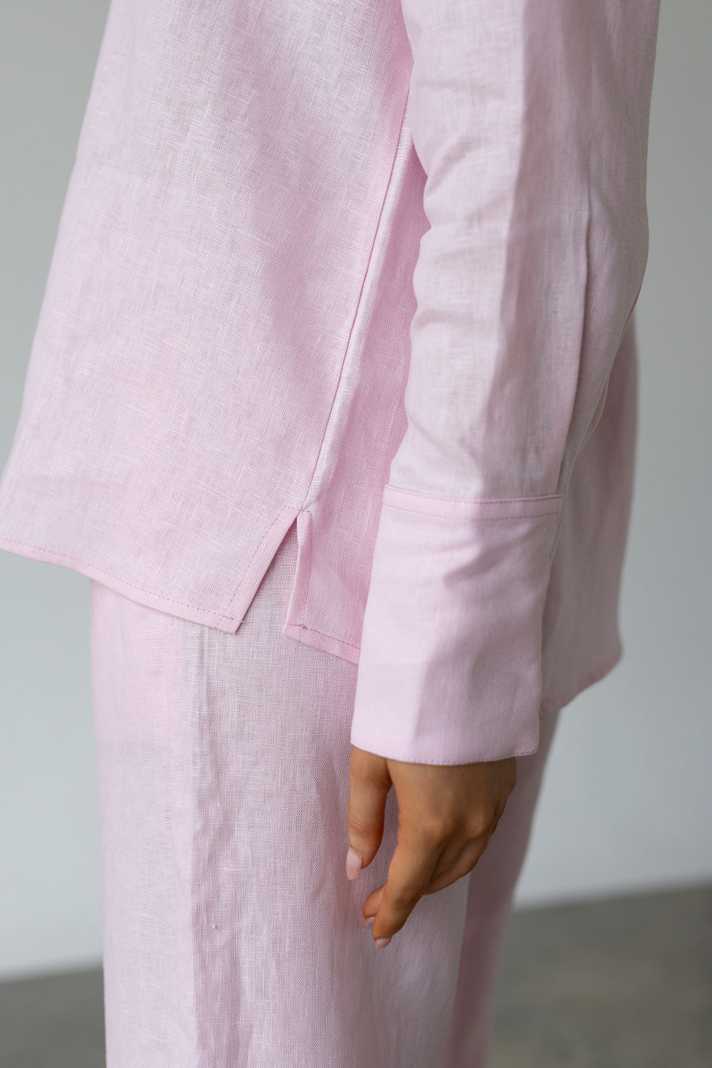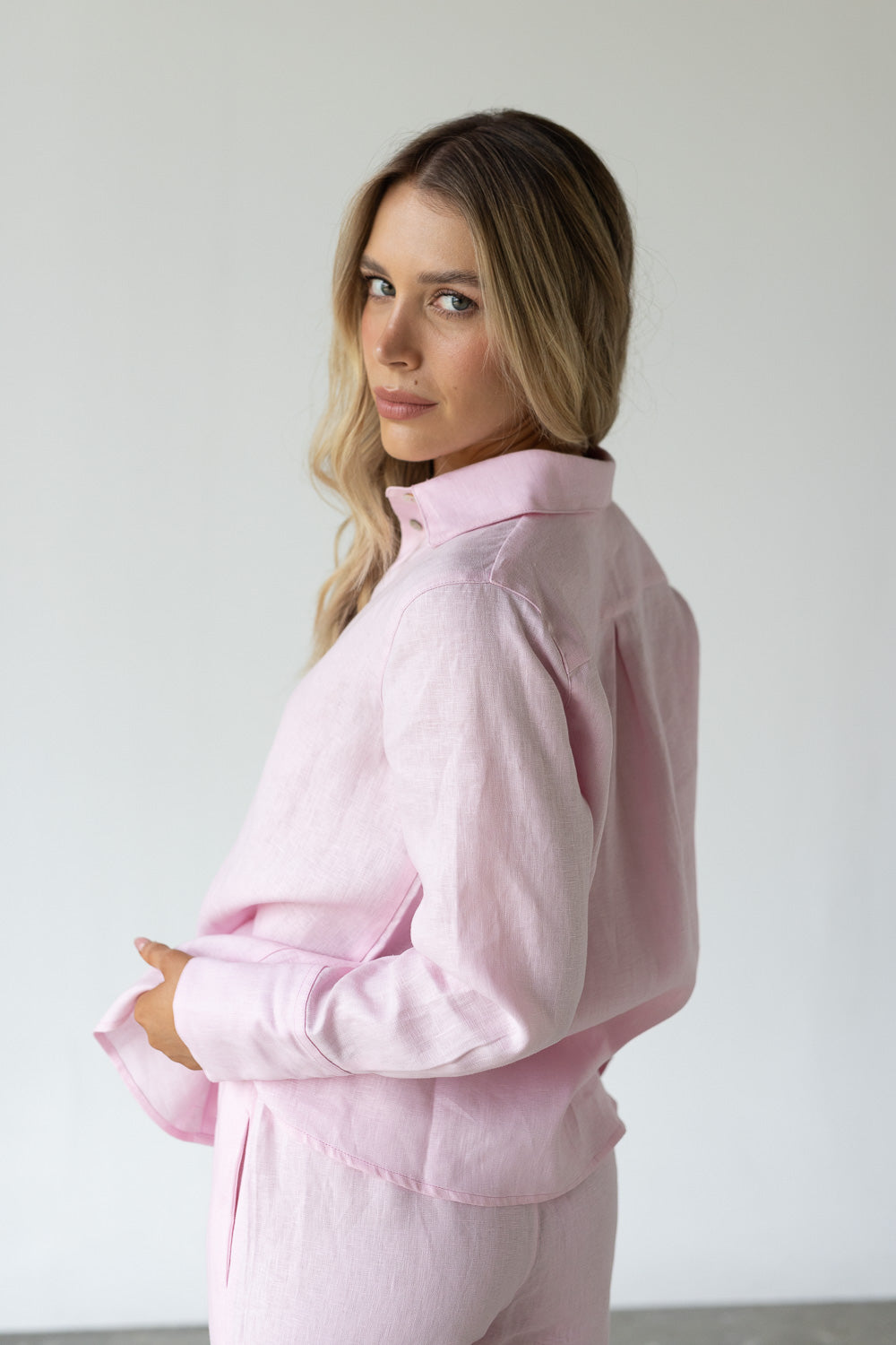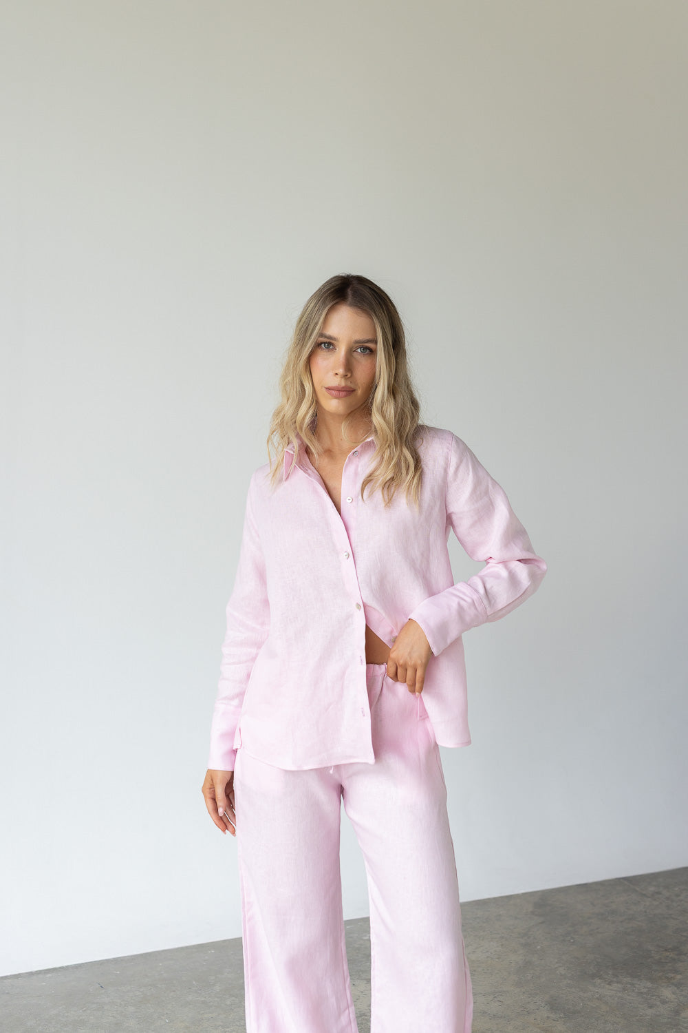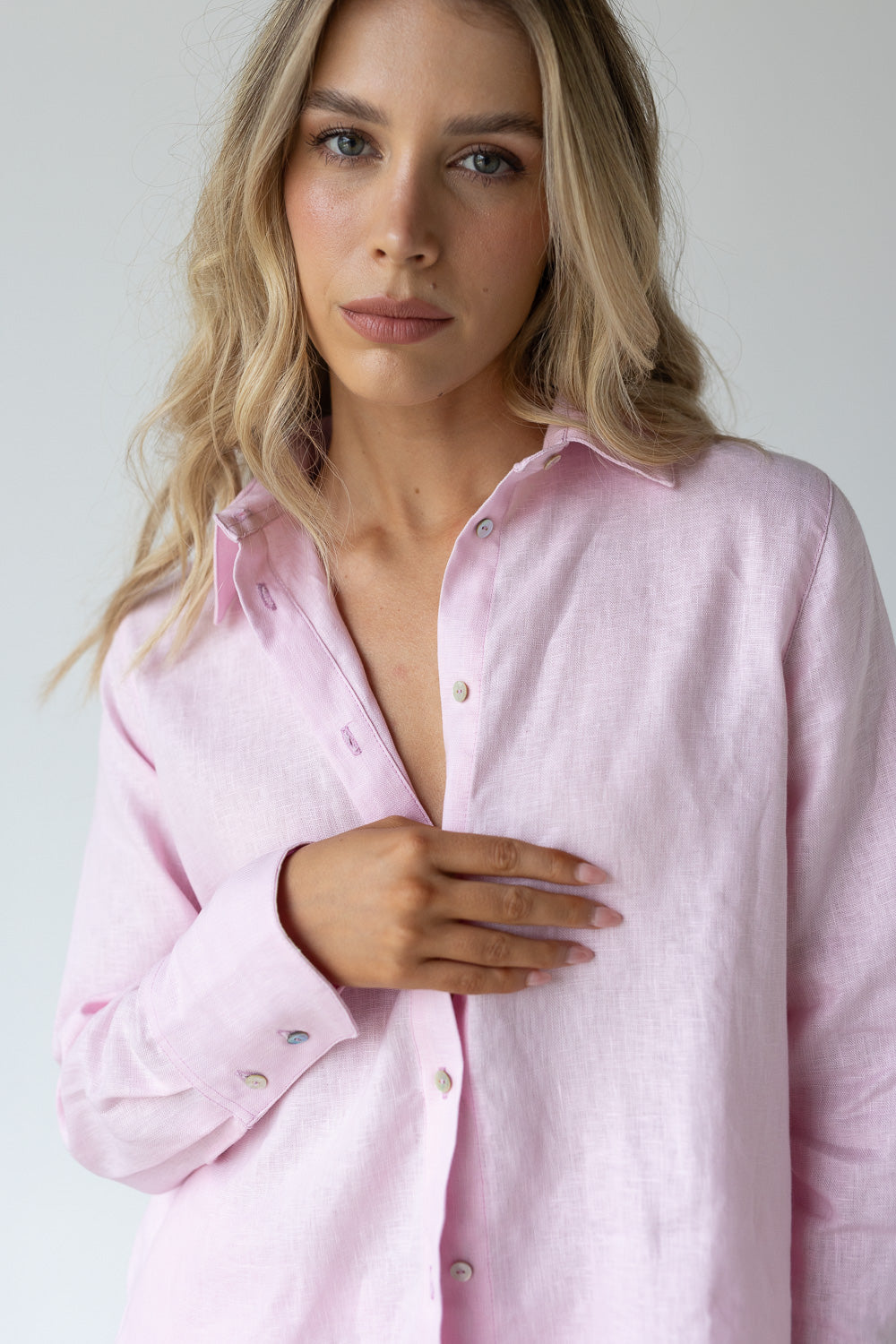Camisa en lino de manga larga, ligera y fresca. Con botones frontales en concha de nácar y un diseño versátil, es perfecta para llevar abierta sobre un top o cerrada para un look más clásico. Una prenda atemporal que se adapta tanto a ocasiones casuales como a momentos más sofisticados.
