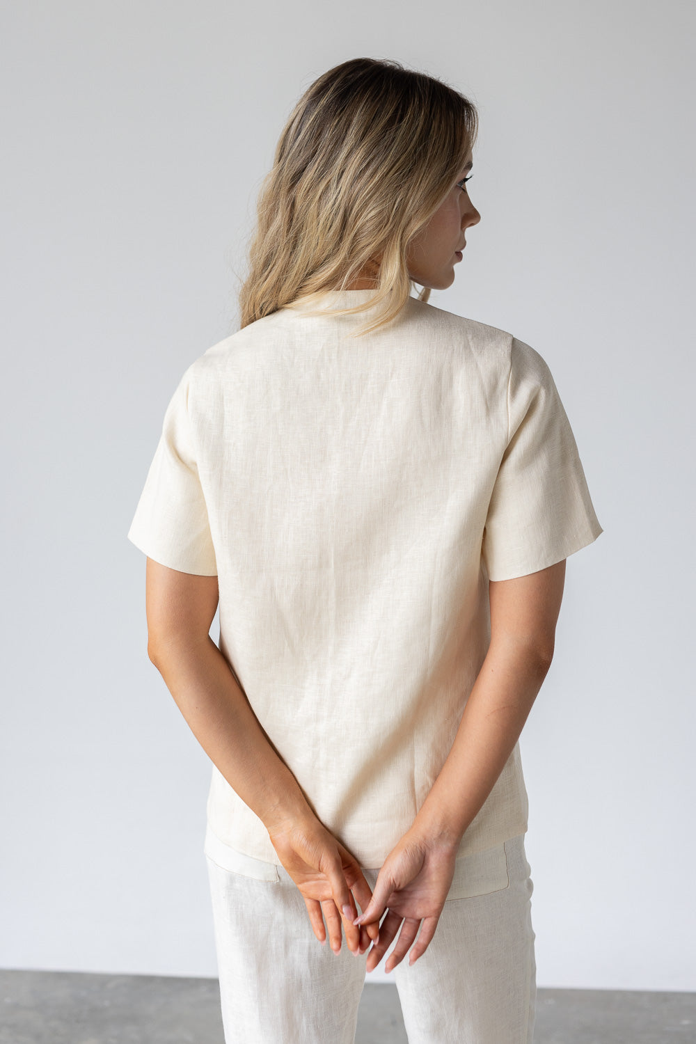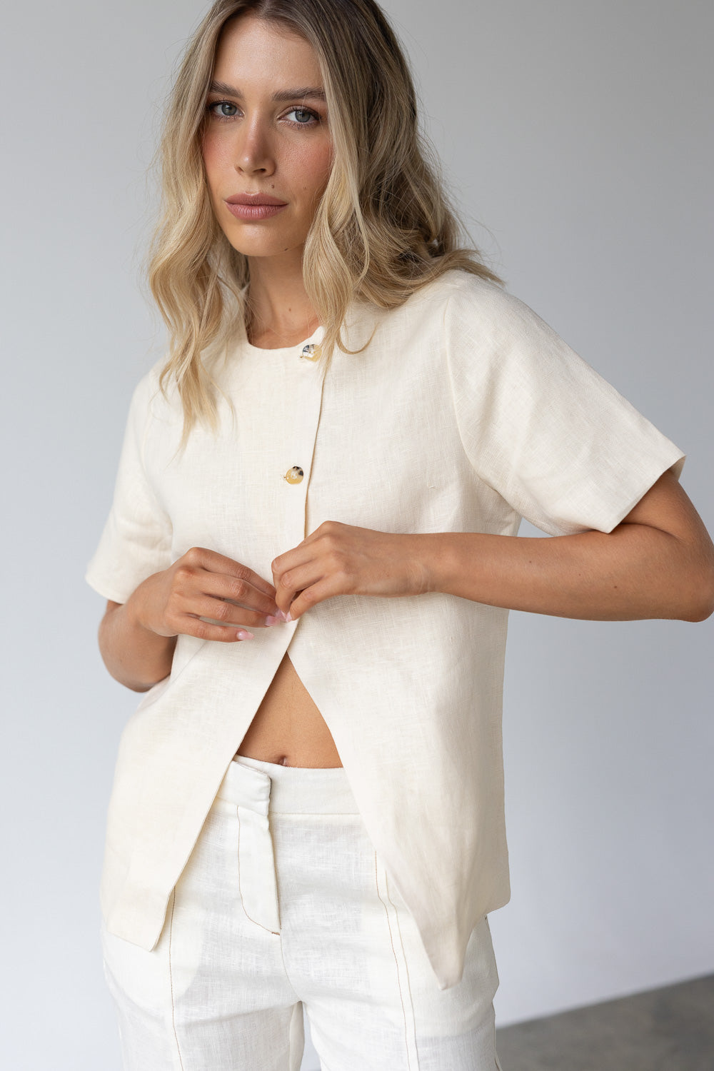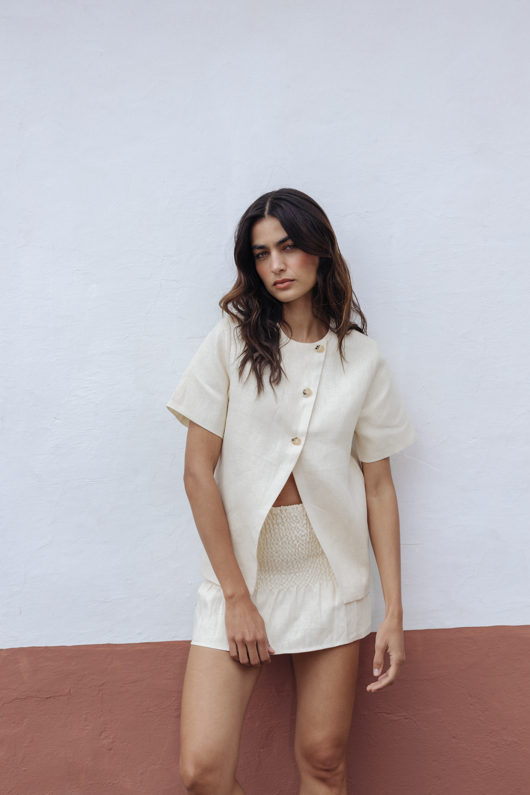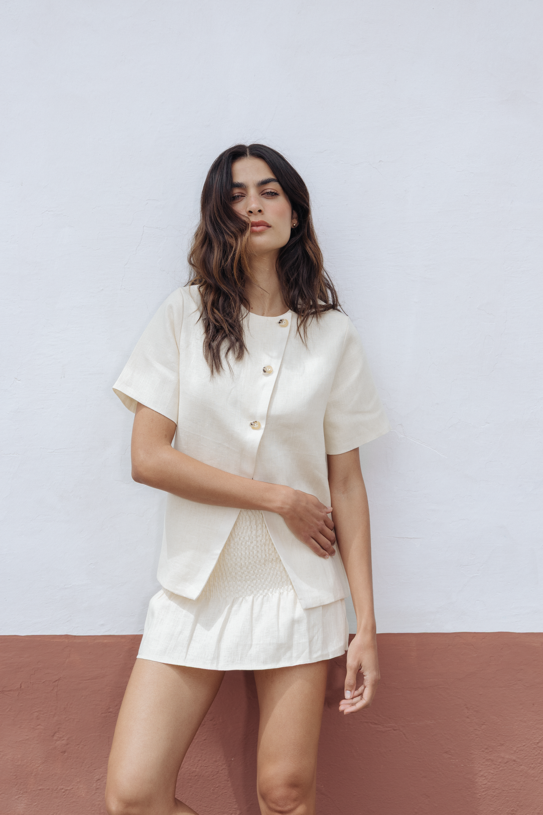 Camisa en lino natural con diseño de doble prenda que aporta un acabado de alta costura. Se cruza al frente y se abotona de forma asimétrica con botones amaderados que suman un detalle especial. Fresca, minimalista y versátil, perfecta para elevar tus looks de verano con sutileza y estilo.