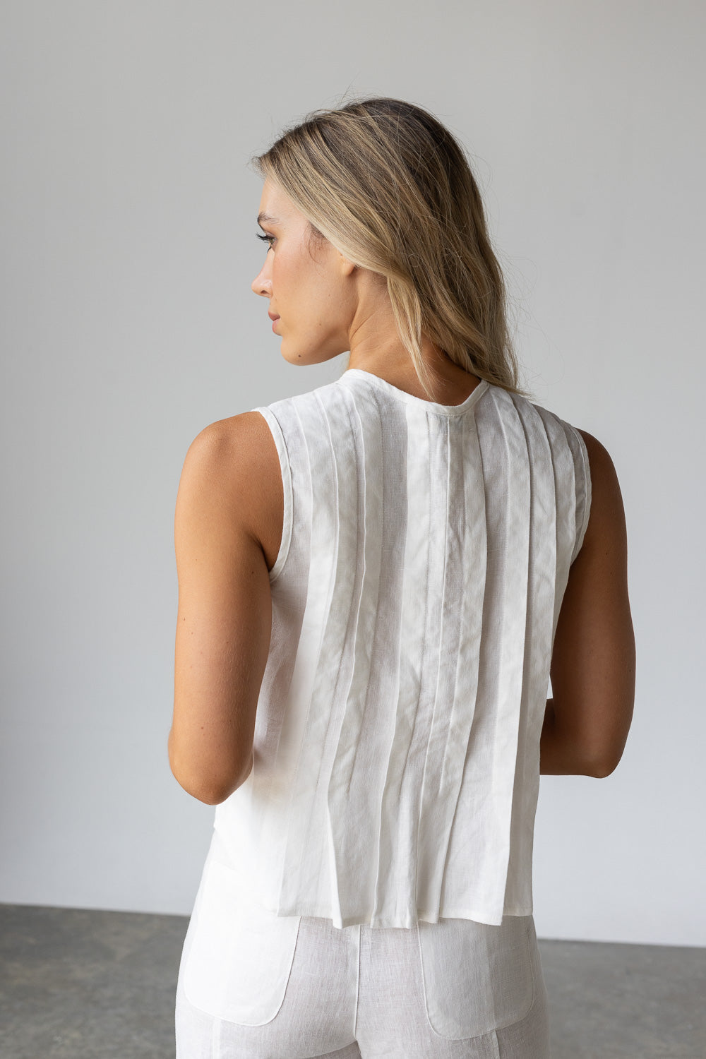 Top hecho en lino natural, con un diseño estructurado de pliegues verticales que aportan textura y movimiento. Sus delicados lazos frontales permiten ajustar la silueta de forma sutil y femenina. Atemporal, fresca y perfecta para días de clima cálido con un toque sofisticado.