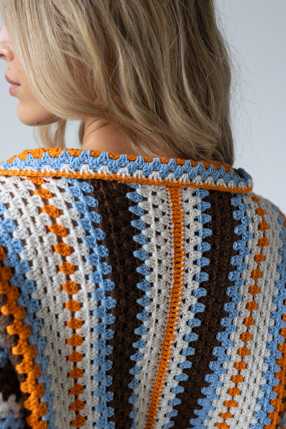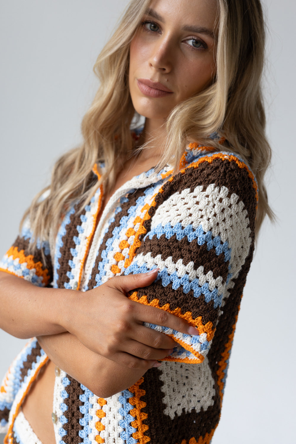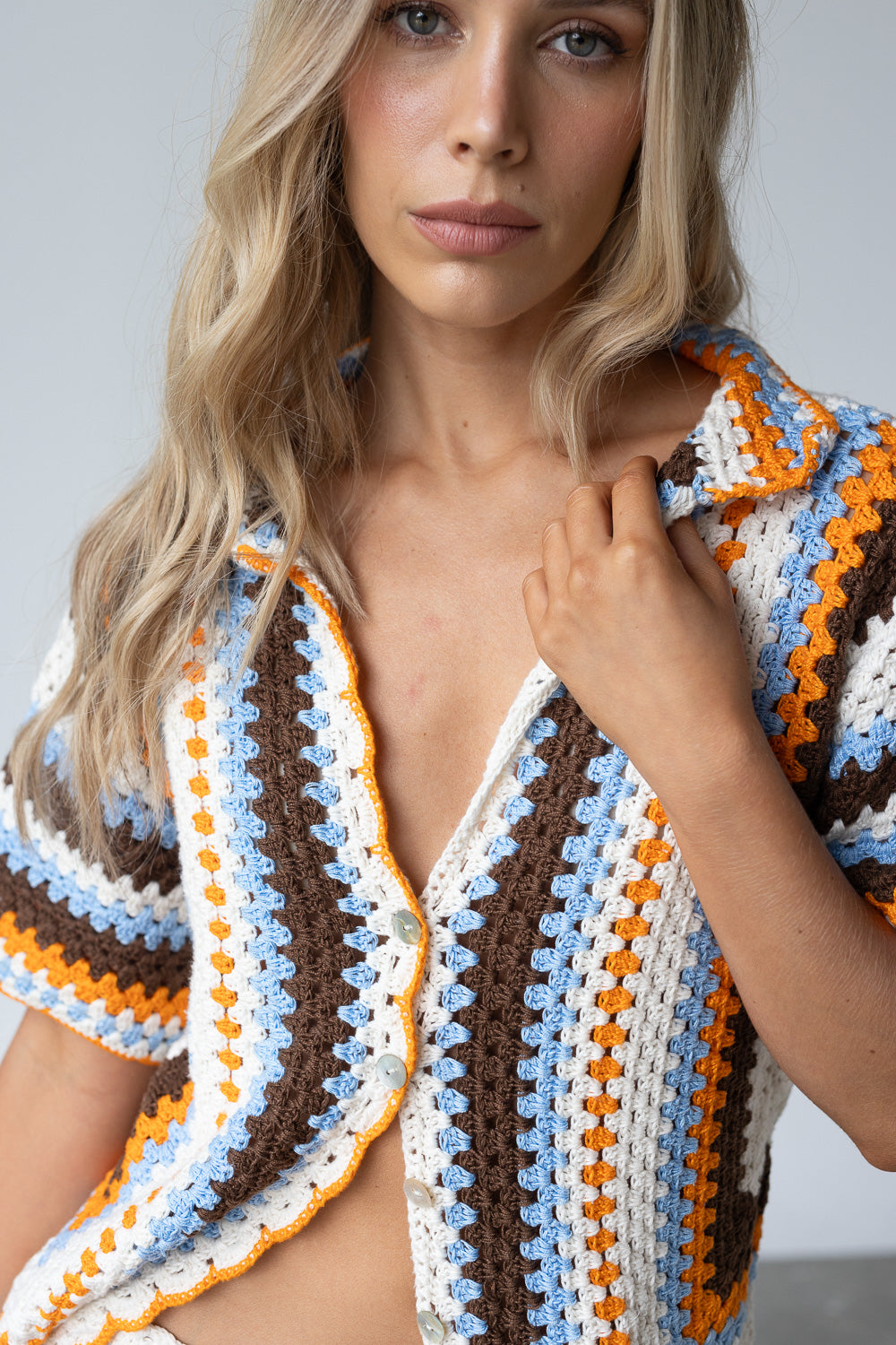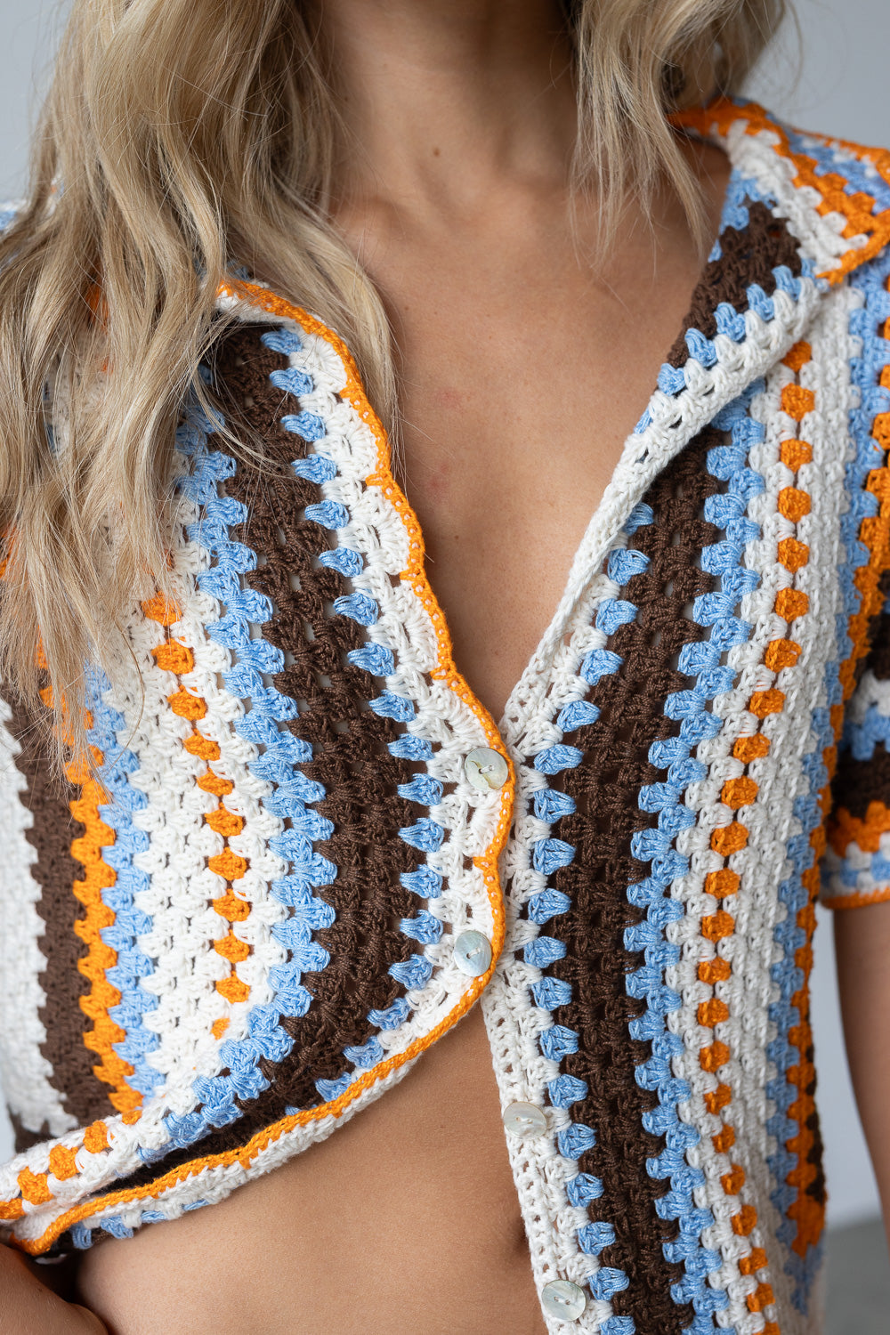 Camisa de crochet hecha a mano con diseño a rayas en tonos vibrantes. De manga corta y botones frontales, combina un estilo artesanal con un aire fresco y versátil. Perfecta para llevar abierta sobre un top o cerrada como protagonista del look.