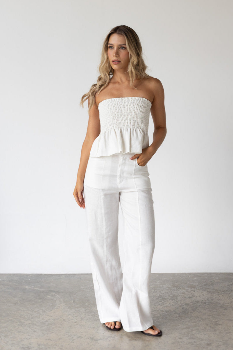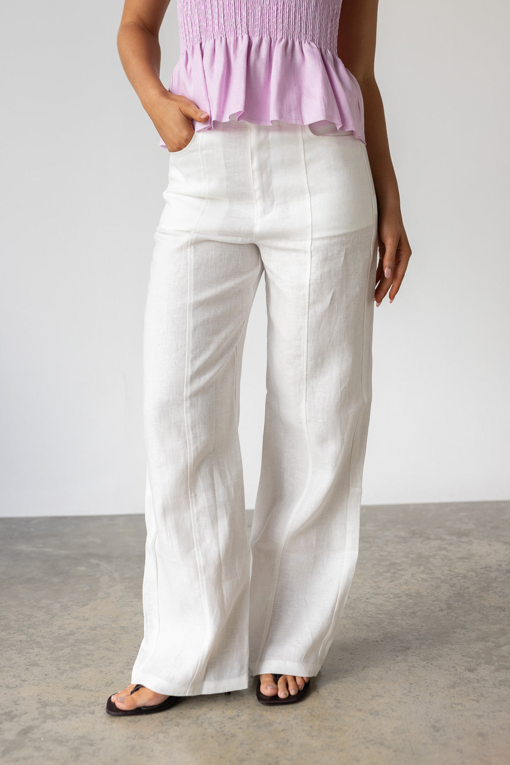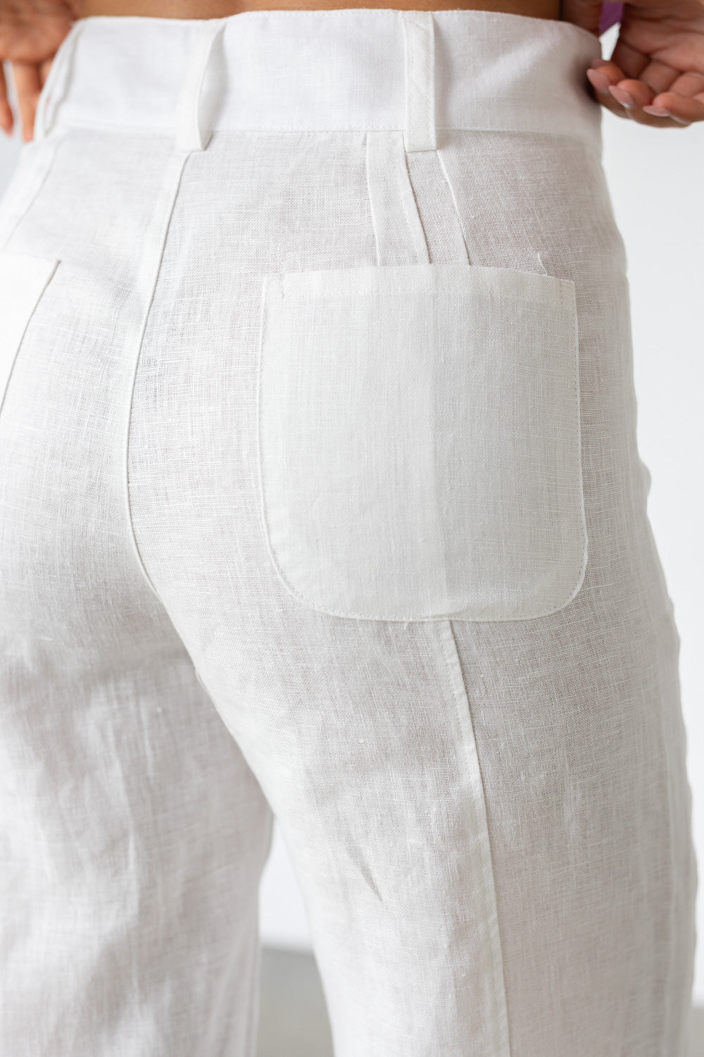 Pantalón tiro alto en lino natural con costuras delanteras y posteriores a tono lo que hace que la horma sea top.