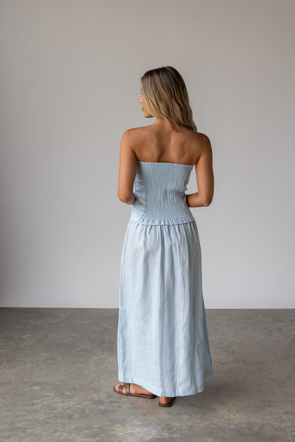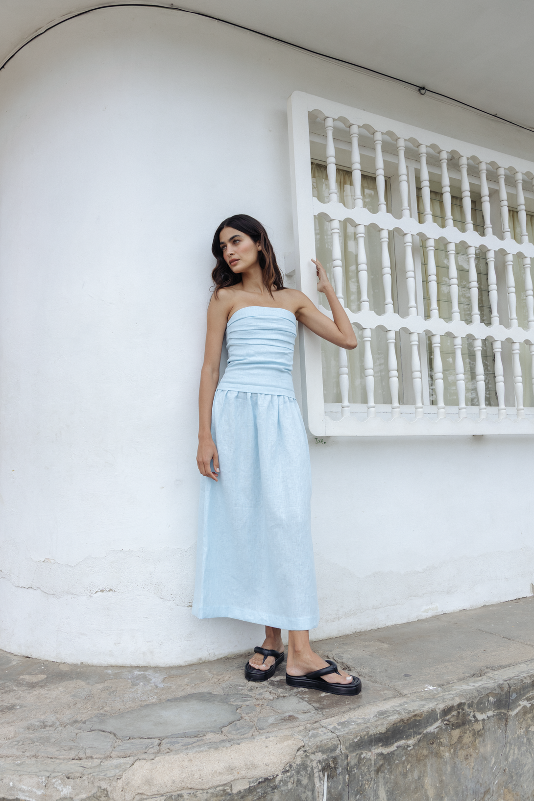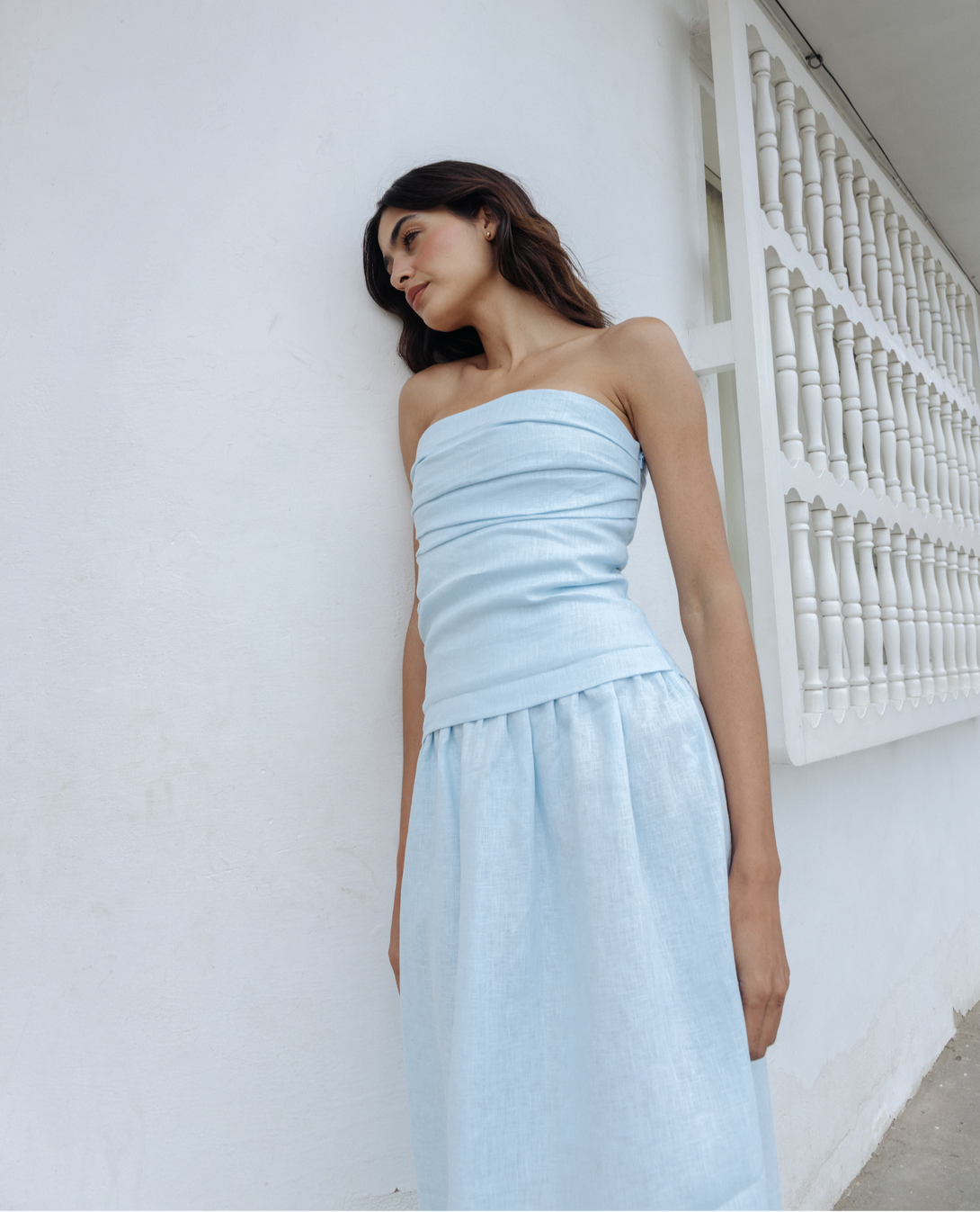 Vestido largo en lino con escote strapless y detalle prensado en el busto. En la parte posterior su diseño es un nido de abeja que hace la función de elástico para que se pueda ajustar bien a tu cuerpo. Su silueta fluida y ligera lo hace ideal para climas cálidos y looks frescos con un aire natural y elegante.