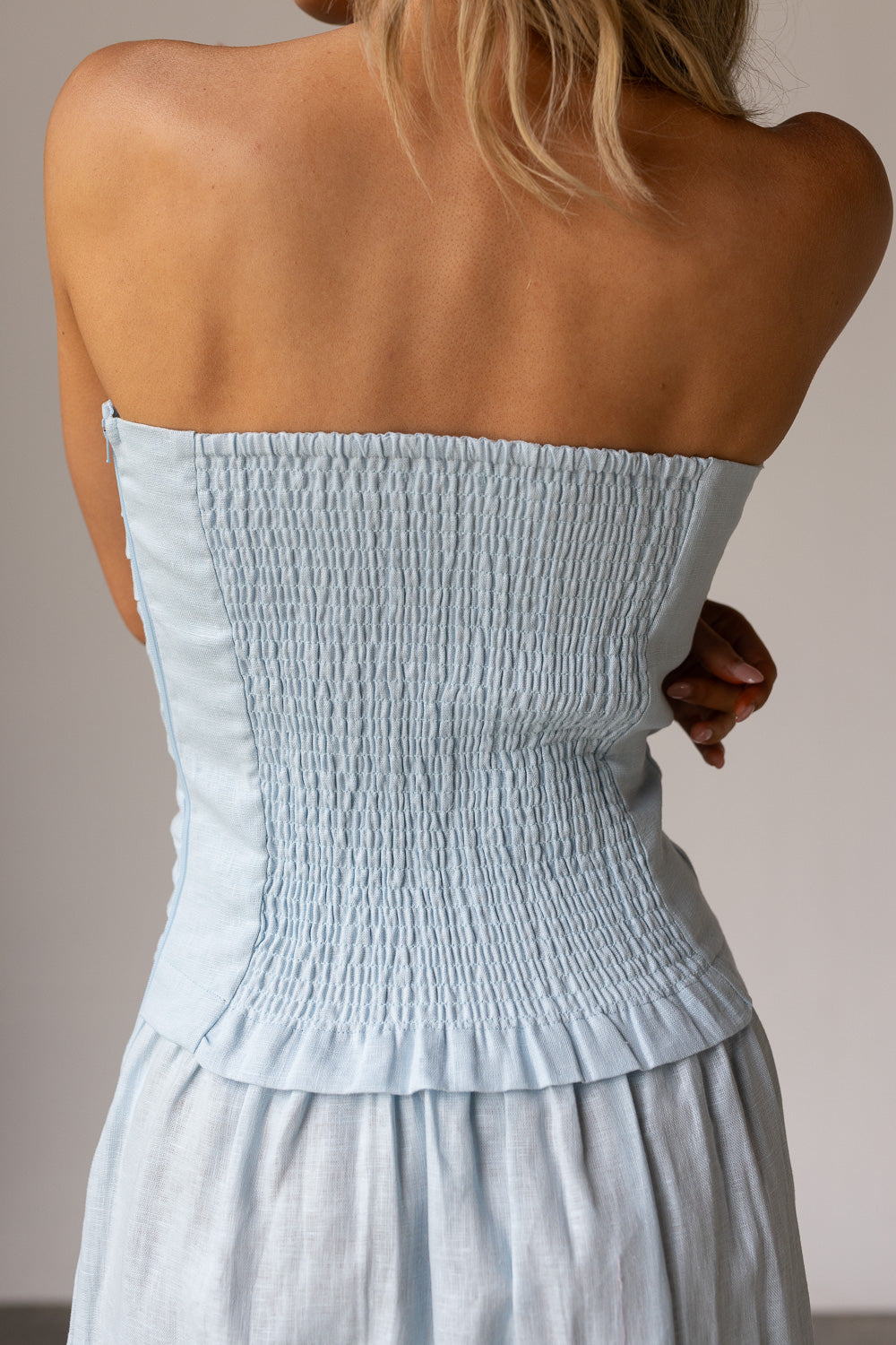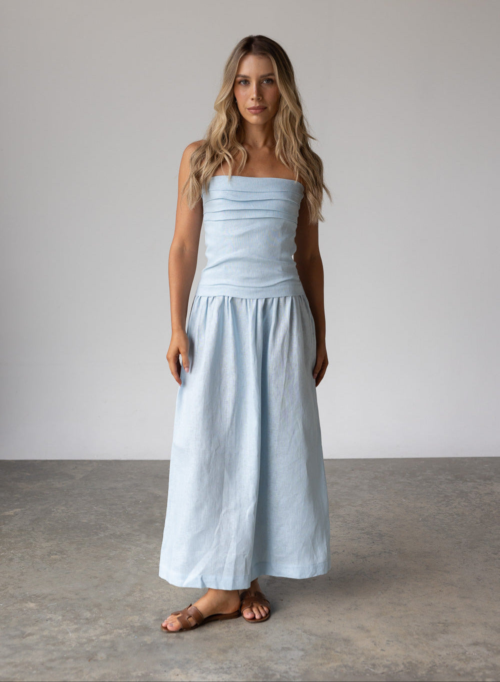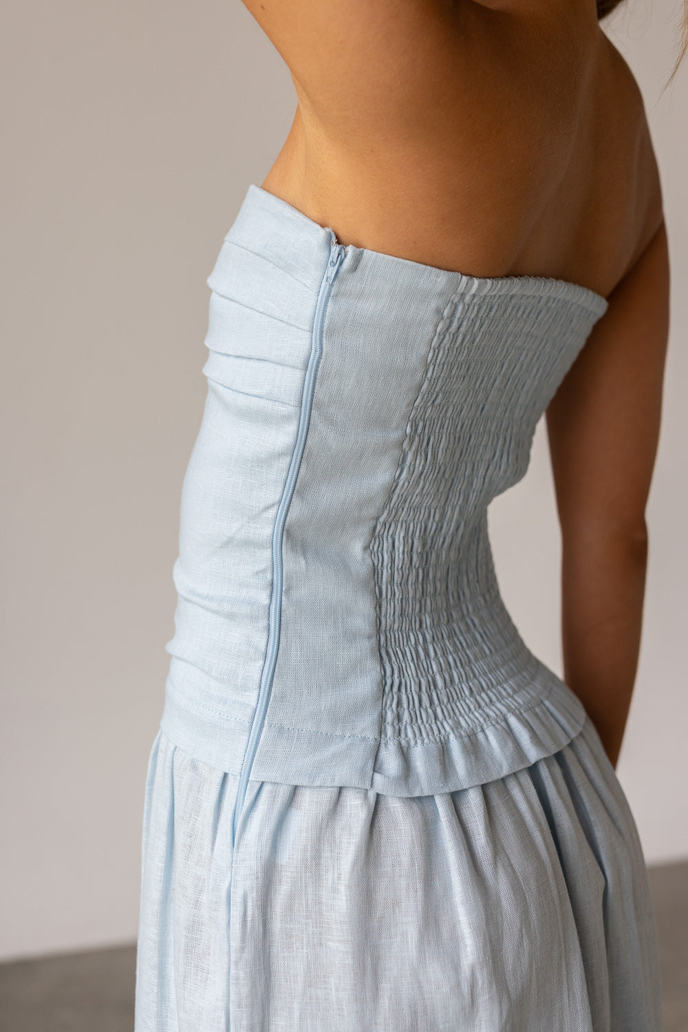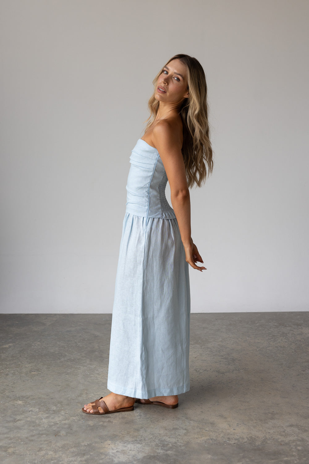 Vestido largo en lino con escote strapless y detalle prensado en el busto. En la parte posterior su diseño es un nido de abeja que hace la función de elástico para que se pueda ajustar bien a tu cuerpo. Su silueta fluida y ligera lo hace ideal para climas cálidos y looks frescos con un aire natural y elegante.