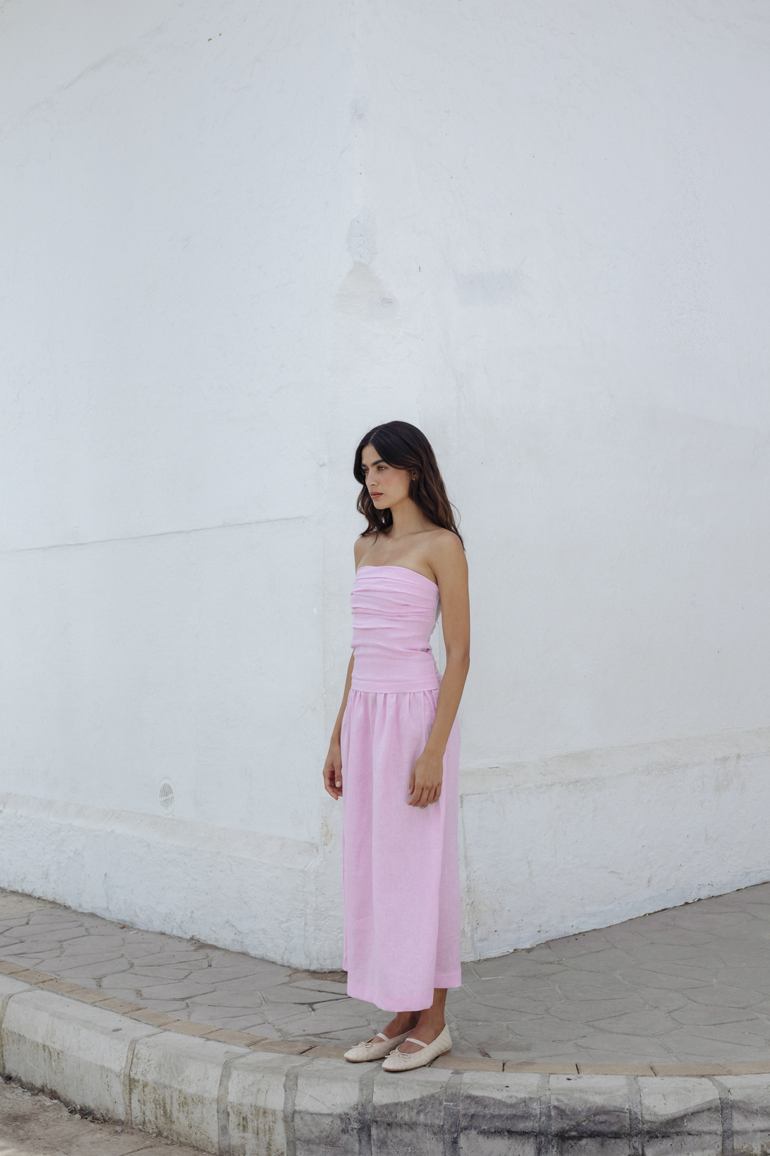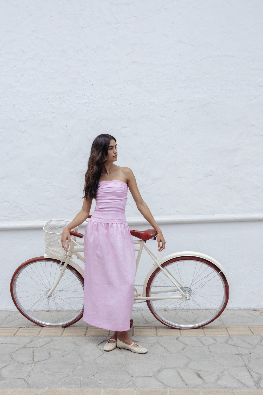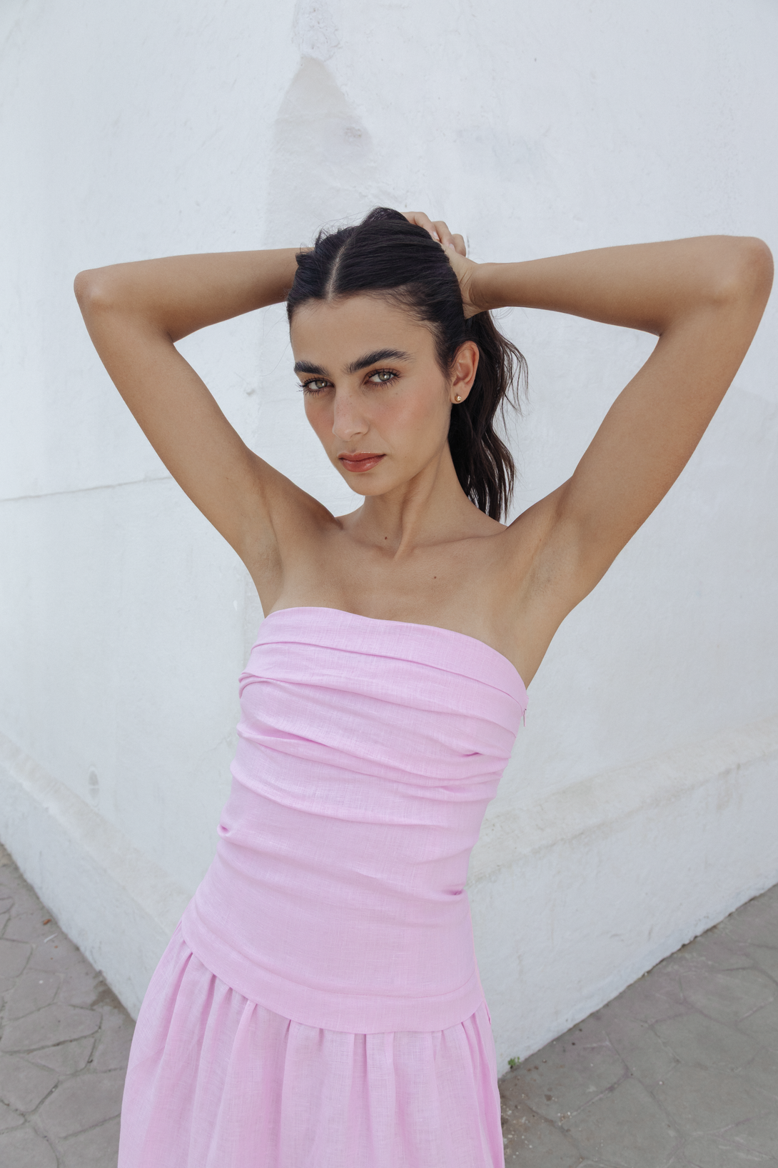 Vestido largo en lino con escote strapless y detalle prensado en el busto. En la parte posterior su diseño es un nido de abeja que hace la función de elástico para que se pueda ajustar bien a tu cuerpo. Su silueta fluida y ligera lo hace ideal para climas cálidos y looks frescos con un aire natural y elegante.