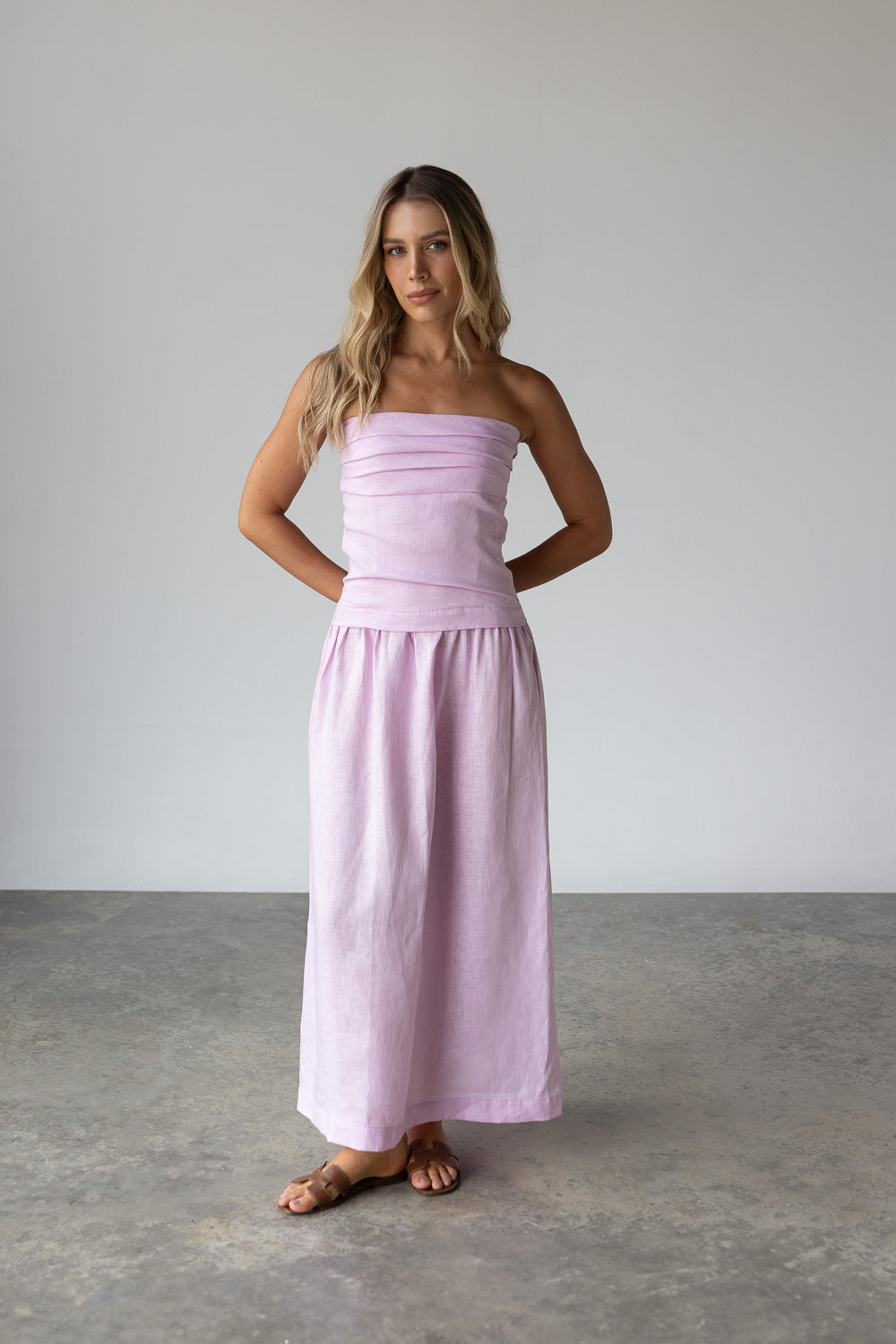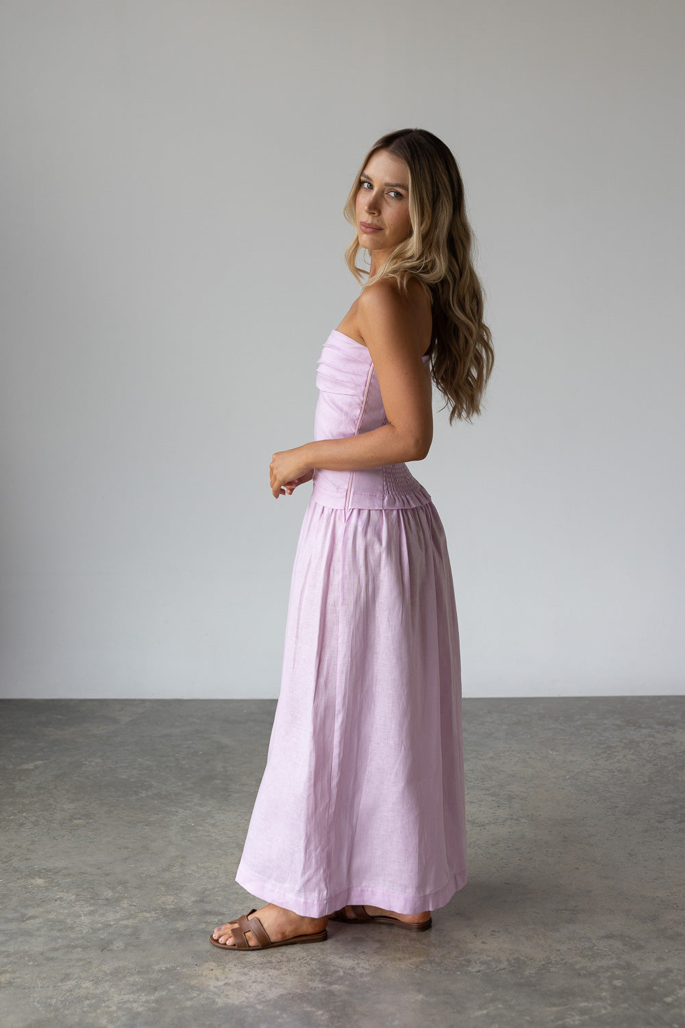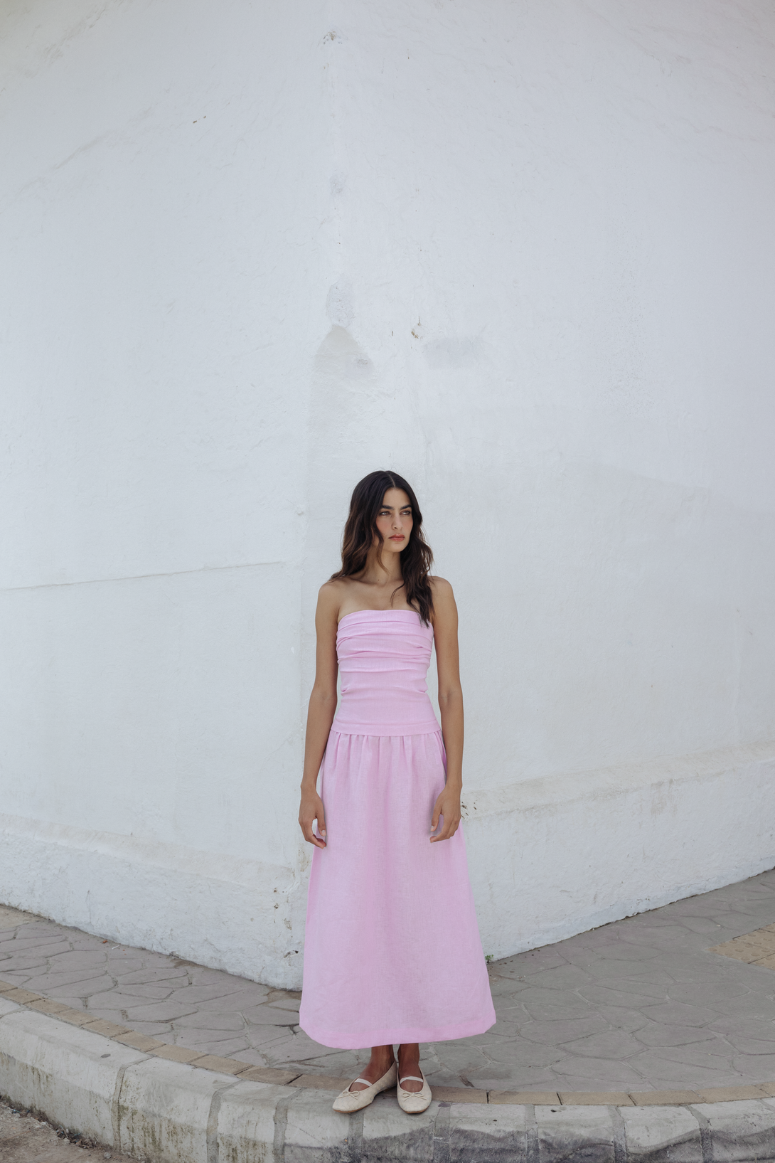Vestido largo en lino con escote strapless y detalle prensado en el busto. En la parte posterior su diseño es un nido de abeja que hace la función de elástico para que se pueda ajustar bien a tu cuerpo. Su silueta fluida y ligera lo hace ideal para climas cálidos y looks frescos con un aire natural y elegante.