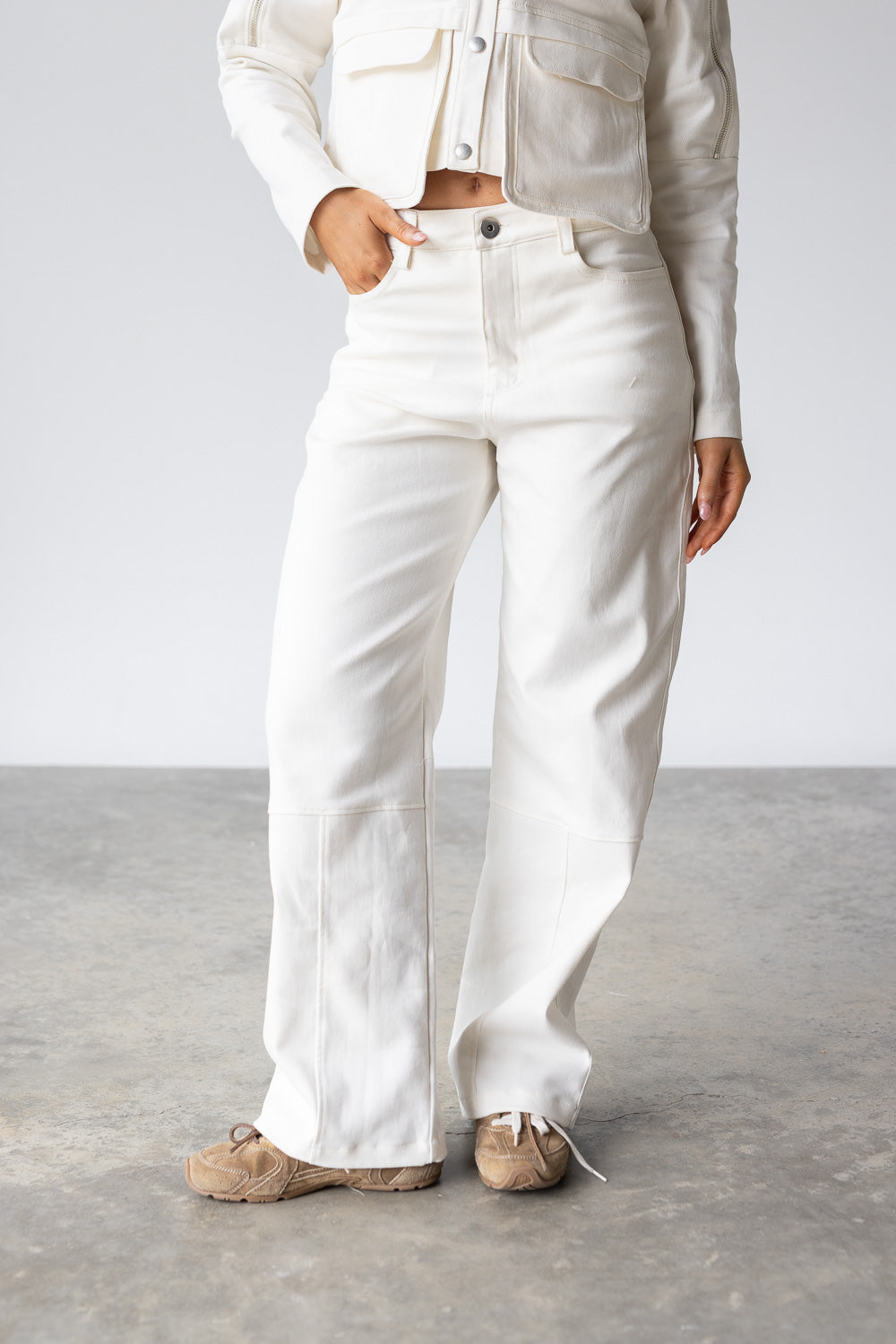 Pantalón en drill crudo, tiro alto y bota recta. Su diseño limpio y versátil lo convierte en un básico atemporal, ideal para llevar con chaquetas o tops ligeros en cualquier ocasión.