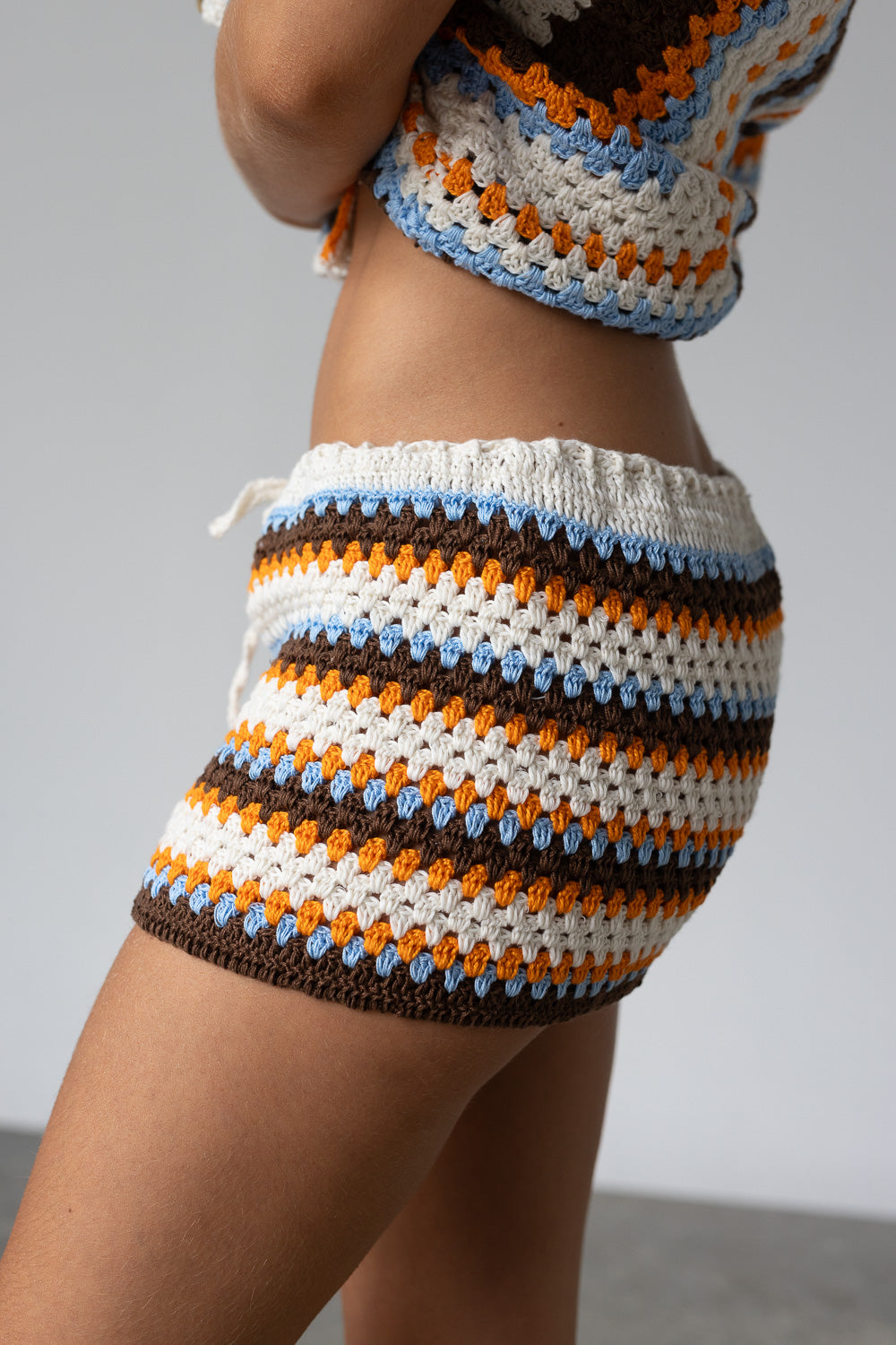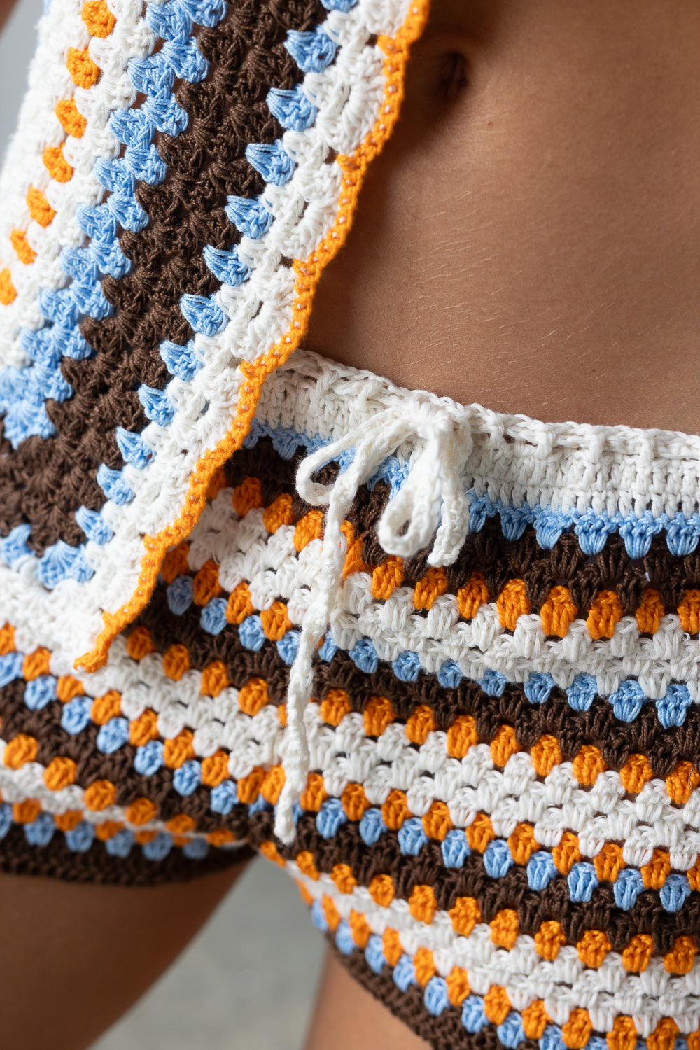 Short de crochet hecho a mano con diseño a rayas en tonos vibrantes. De tiro bajo y con tira ajustable en la cintura, es una prenda fresca y versátil que aporta un aire artesanal y auténtico a tus looks.