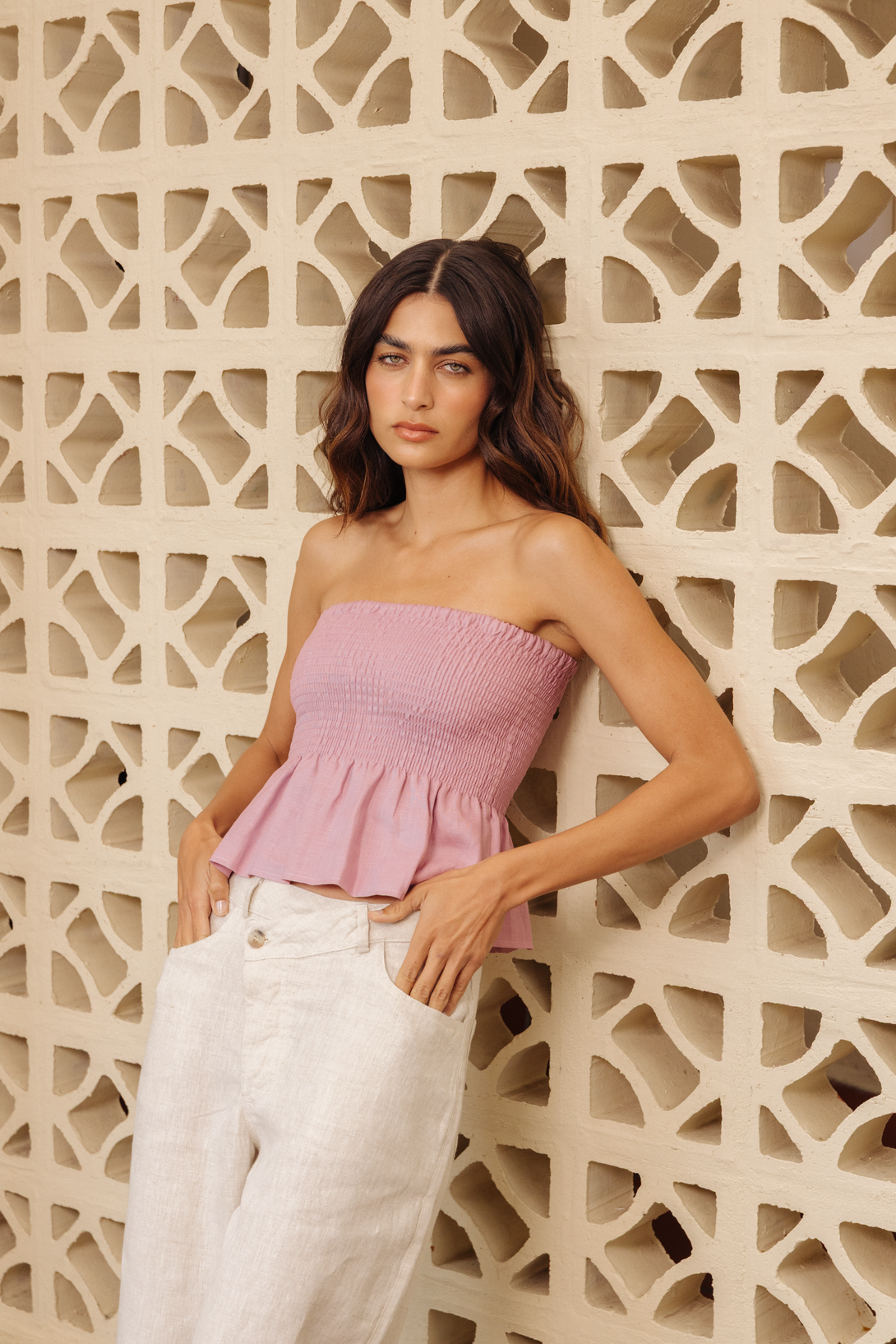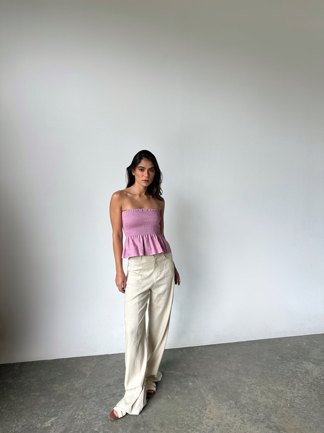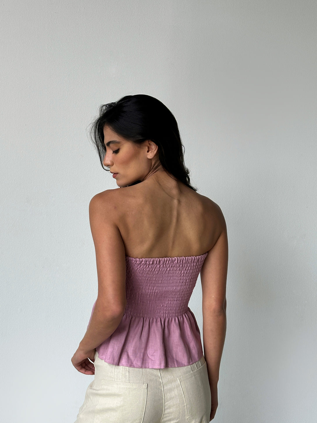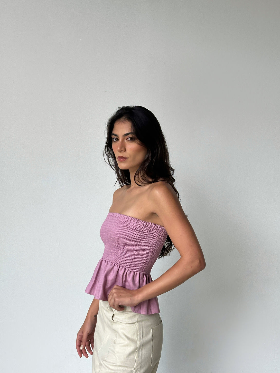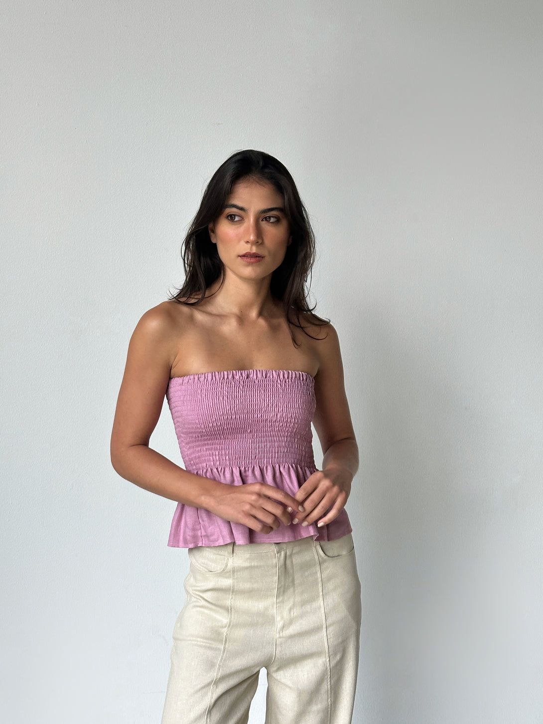 Strapless con detalle de nido de abeja en el busto y vuelo sutil en la base. Hecho en lino natural, es una prenda fresca y femenina ideal para climas cálidos y looks especiales.