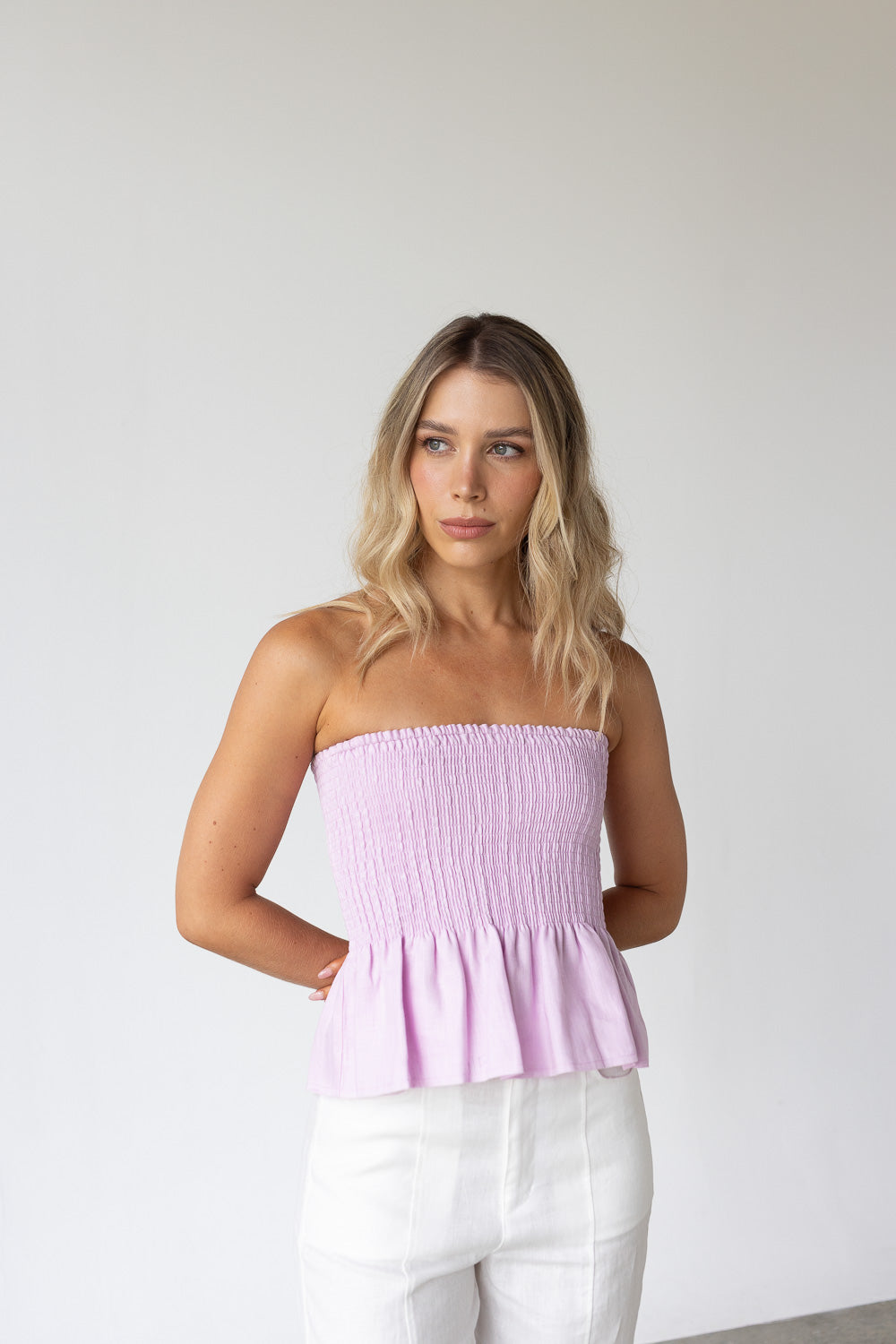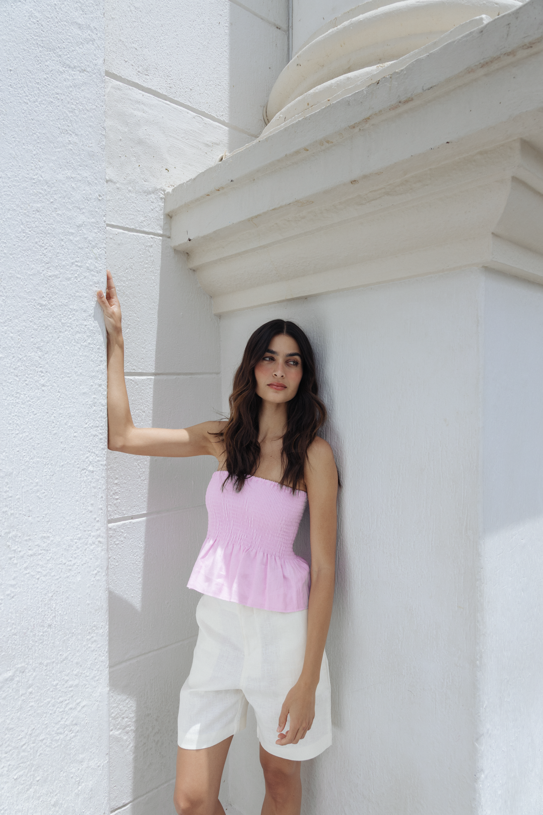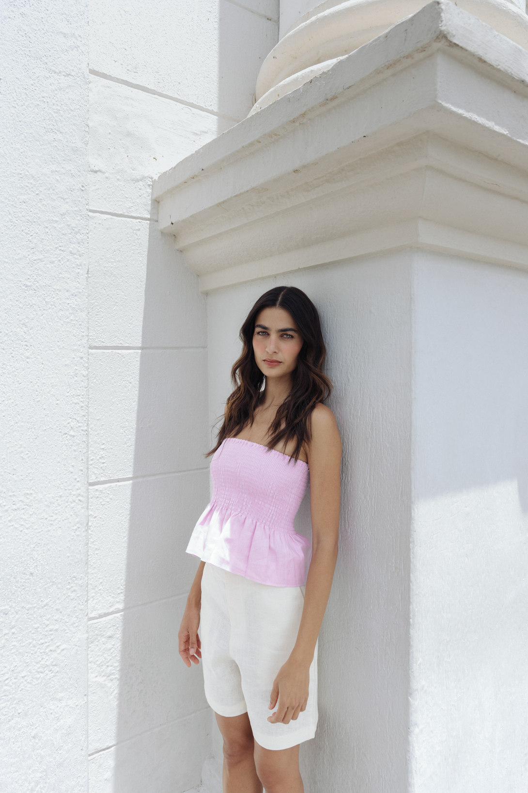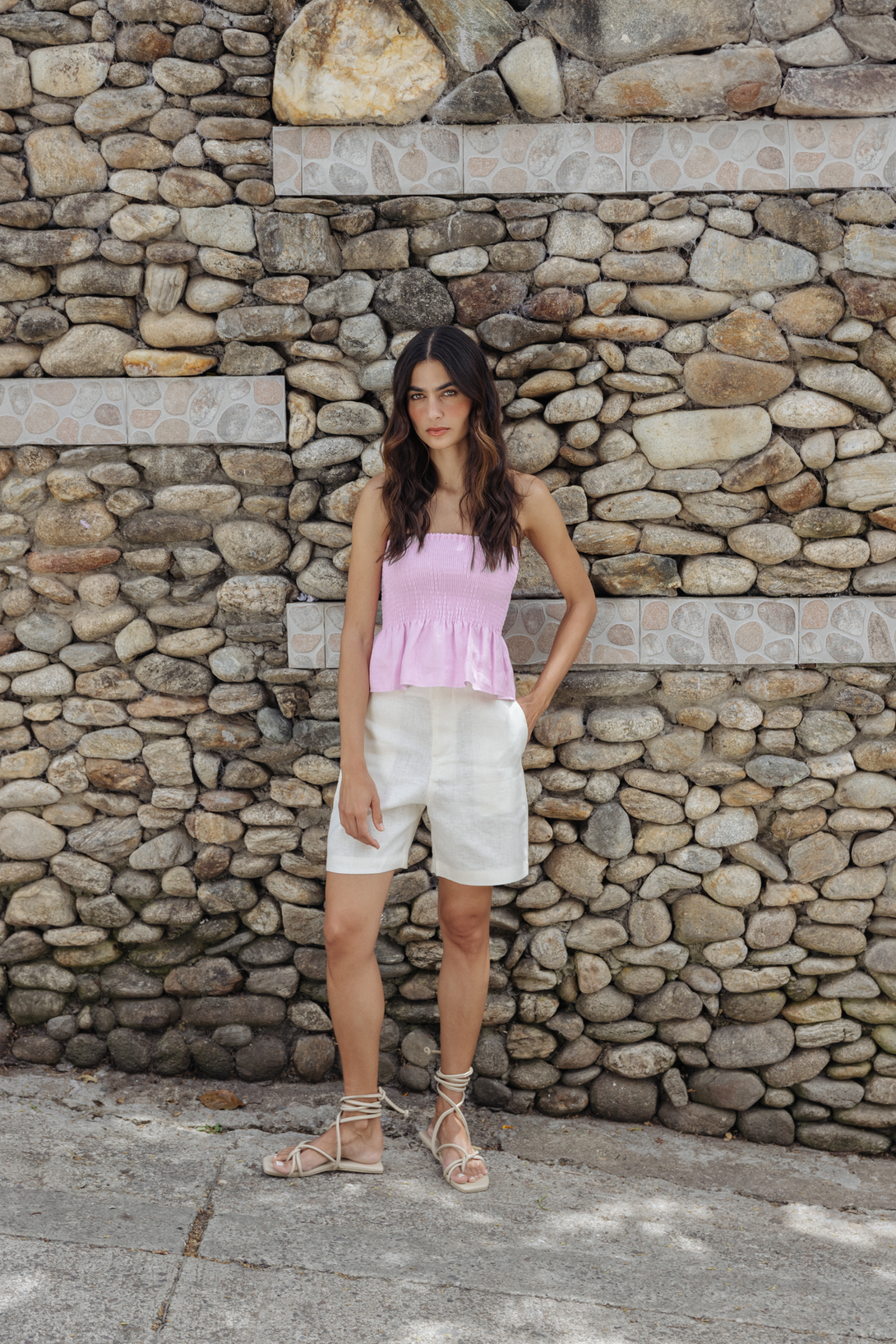 Strapless con detalle de nido de abeja en el busto y vuelo sutil en la base. Hecho en lino natural, es una prenda fresca y femenina ideal para climas cálidos y looks especiales.